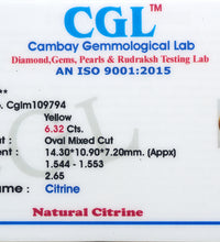 Our **Natural Citrine** is **CGL certified**, ensuring authenticity and exceptional quality. This **faceted oval-cut Citrine** weighs **6.32 carats (6.95 Ratti)** and radiates a warm golden hue, symbolizing abundance, confidence, and positivity.