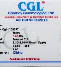 Our **Natural Citrine** is **CGL certified**, ensuring authenticity and radiant quality. This **faceted emerald-cut Citrine** weighs **3.33 carats (3.66 Ratti)** and glows with a warm golden hue, symbolizing abundance, joy, and success.
