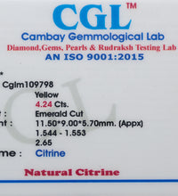 Our **Natural Citrine** is **CGL certified**, ensuring authenticity and superior quality. This **faceted emerald-cut Citrine** weighs **4.34 carats (4.77 Ratti)** and glows with a vibrant golden hue, symbolizing abundance, confidence, and success.