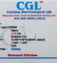 Our **Natural Citrine** is **CGL certified**, ensuring authenticity and premium quality. This **faceted emerald-cut Citrine** weighs **4.39 carats (4.83 Ratti)** and radiates a warm golden glow, symbolizing abundance, confidence, and positivity.