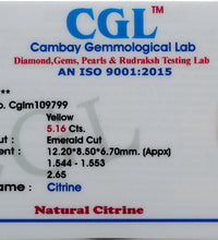 Our **Natural Citrine** is **CGL certified**, ensuring authenticity and superior quality. This **faceted emerald-cut Citrine** weighs **5.16 carats (5.68 Ratti)** and radiates a vibrant golden hue, symbolizing abundance, positivity, and success.