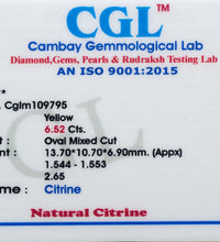 Our **Natural Citrine** is **CGL certified**, ensuring authenticity and superior quality. This **faceted oval-cut Citrine** weighs **6.52 carats (7.17 Ratti)** and radiates a warm golden glow, symbolizing abundance, positivity, and success.
