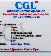 Our **Natural Quartz Cat’s Eye** is **CGL certified**, ensuring authenticity and exceptional quality. This **oval cabochon-cut Cat’s Eye** weighs **6.61 carats (7.27 Ratti)** and displays a striking chatoyant band, symbolizing protection, intuition, and prosperity.