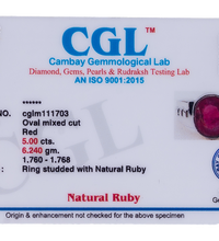 Certified Natural Bangkok Ruby (Manik) 5.00 ct (5.50 Ratti) Faceted Cushion Cut Ring