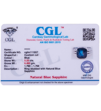 Certification:Certified Natural Blue Sapphire (Neelam) 5.25ct (5.78 Ratti) Faceted Cushion Cut Ring
