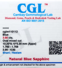 Certification: CGL Certified Natural Neelam (Blue Sapphire) 3.86 ct (4.25 Ratti) Faceted Oval Cut Gemstone