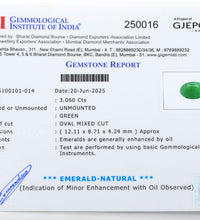 Certification: GII Certified Natural Panna (Emerald) 3.06 ct (3.37 Ratti) Faceted Oval Cut Gemstone