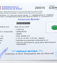 Certification: GII Certified Natural Panna (Emerald) 3.09 ct (3.40 Ratti) Faceted Oval Cut Gemstone