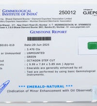 Certification: GII Certified Natural Panna (Emerald) 3.47 ct (3.82 Ratti) Faceted Octagon Cut Gemstone