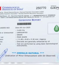 Certification: GII Certified Natural Panna (Emerald) 3.62 ct (3.98 Ratti) Faceted Pear Cut Gemstone