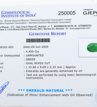 Certification: GII Certified Natural Panna (Emerald) 4.45 ct (4.90 Ratti) Faceted Oval Cut Gemstone