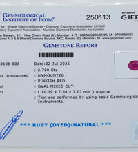 This GII Certified Natural Manik (Ruby) gemstone is naturally mined from Bangkok and weighs 2.07 carats (2.97 ratti). The oval faceted cut enhances its fiery red brilliance, symbolizing vitality and authority. Known as the gemstone of the Sun, Ruby (Manik) is revered for bringing confidence, courage, and prosperity to its wearer.