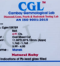 Certification: CGL Certified Natural Manik (Ruby) 4.91 ct (5.40 Ratti) Faceted Oval Cut Gemstone