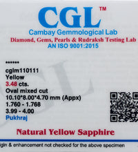 This CGL Certified Natural Pukhraj (Yellow Sapphire) gemstone is sourced from the mines of Sri Lanka and showcases a radiant golden-yellow hue with excellent transparency. Weighing 3.48 carats (3.83 ratti) and crafted in an oval faceted cut, it symbolizes wisdom, prosperity, and spiritual enlightenment. Ideal for those seeking harmony in relationships and success in life, this gemstone combines authenticity with astrological significance.