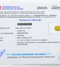 Our Pukhraj (Yellow Sapphire) gemstone is naturally mined from Sri Lanka and comes with GII certification, ensuring its authenticity, radiant yellow hue, and natural clarity. Weighing 4.99 carats (5.49 ratti) with an oval faceted cut, this gemstone symbolizes wisdom, prosperity, and emotional balance, making it an excellent choice for enhancing personal and marital harmony.