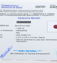 Certification: GII Certified Natural Manik (Ruby) 1.95 ct (2.15 Ratti) Faceted Oval Gemstone