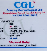 Certification: CGL Certified Natural Manik (Ruby) 5.39 ct (5.93 Ratti) Faceted Emerald Cut Gemstone