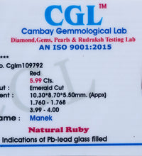 This CGL Certified Natural Manik (Ruby) gemstone is naturally mined from Bangkok and weighs 5.99 carats (6.59 ratti). Its emerald faceted cut highlights the vivid red hue, symbolizing vitality, passion, and prosperity—perfect for emotional balance, career growth, and harmonious relationships.