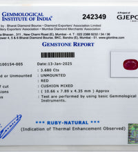 This GII Certified Natural Manik (Ruby) gemstone is naturally mined from Mozambique and weighs 4.25 carats (4.68 ratti). The cushion-cut...