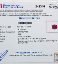 This GII Certified Natural Manik (Ruby) gemstone is naturally mined from Mozambique and weighs 4.65 carats (5.12 ratti). The cushion-cut...