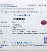 This GII Certified Natural Manik (Ruby) gemstone is naturally mined from Mozambique and weighs 5.94 carats (6.53 ratti). The oval...