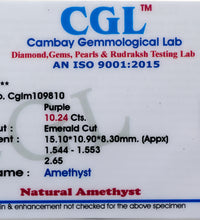 Our **Natural Amethyst** is **CGL certified**, ensuring authenticity and premium quality. This **faceted emerald-cut Amethyst** weighs **10.24 carats (11.26 Ratti)**, making it a stunning choice for collectors, healers, or those seeking balance and positivity.