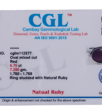 Certified Natural Bangkok Ruby (Manik) 6.75 ct (7.43 Ratti) Faceted Cushion Cut Ring